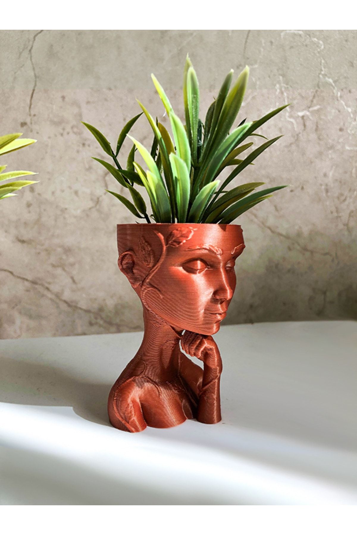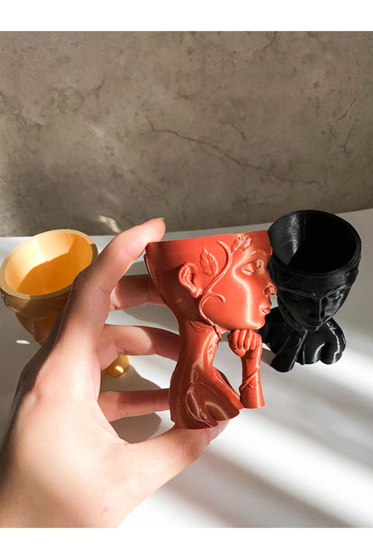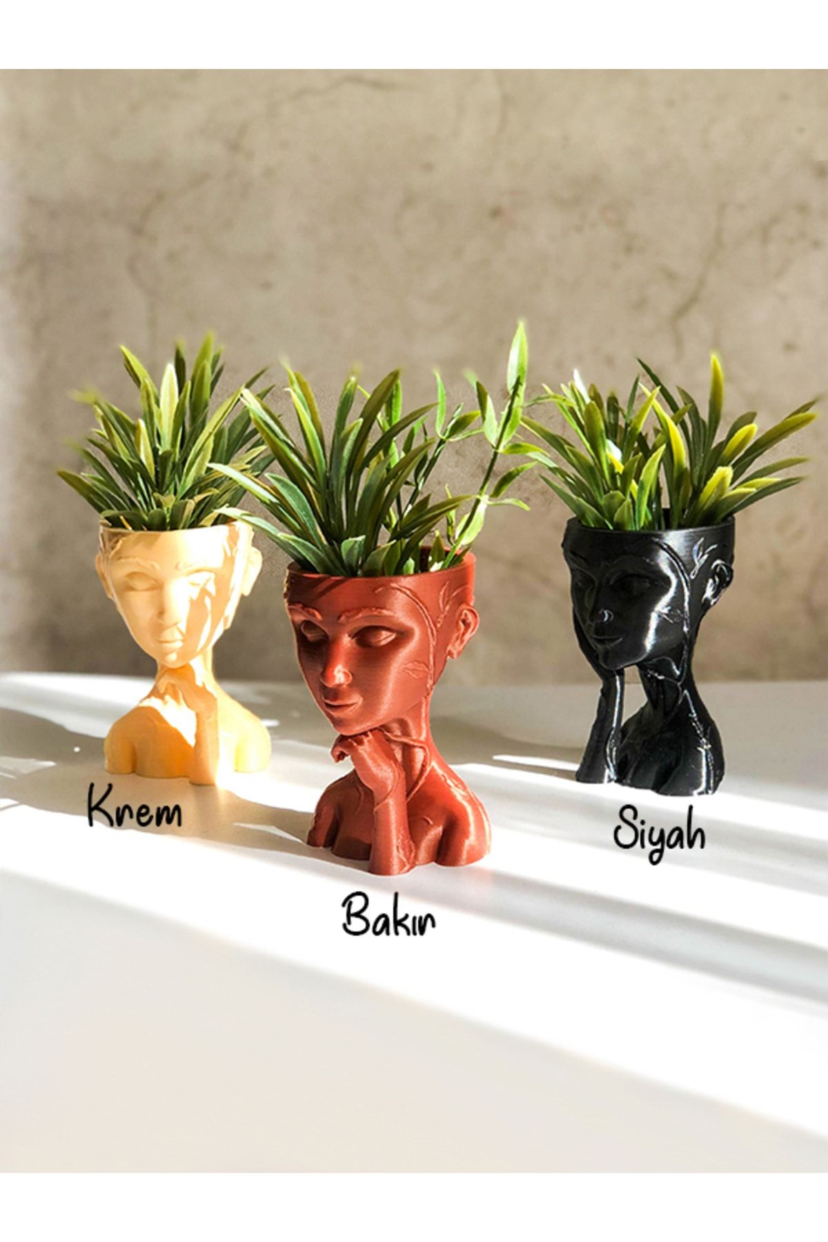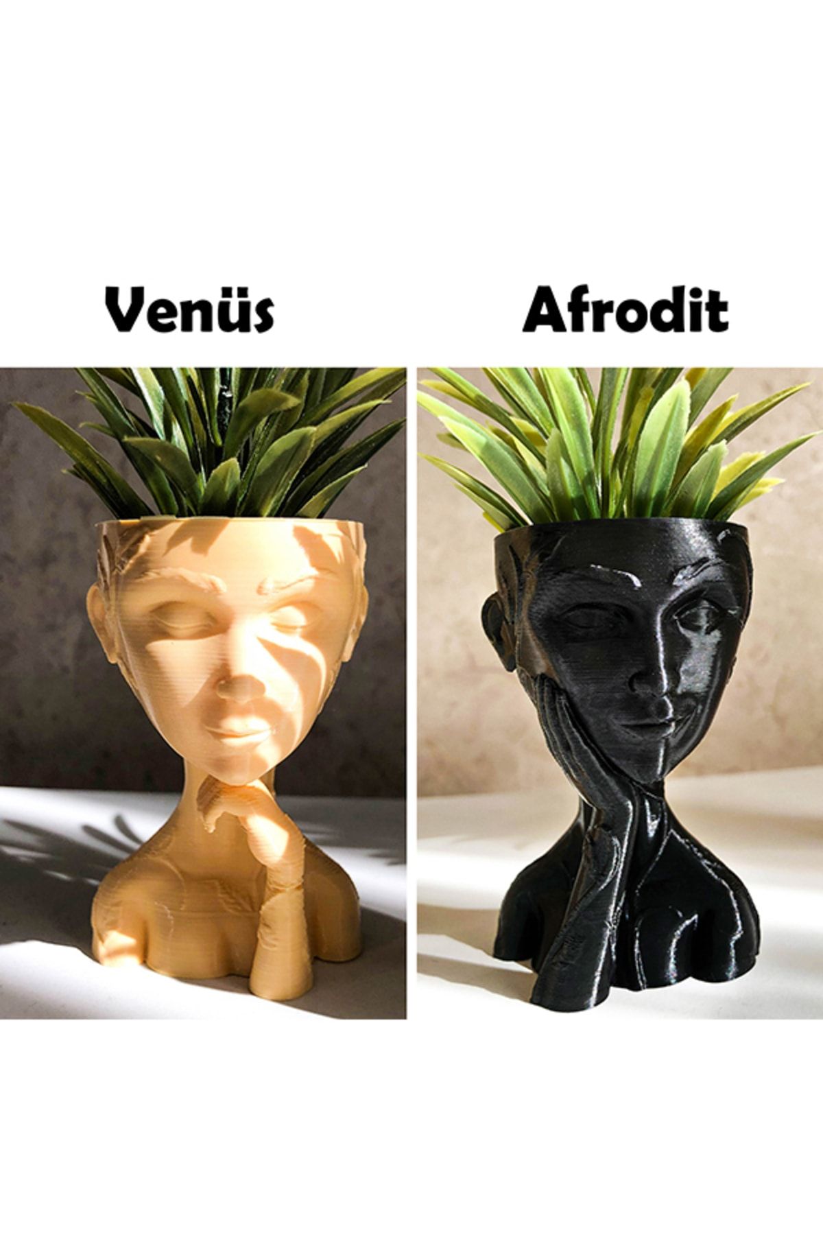 Sukulent gibi küçük bitkileriniz için kullanabilirsiniz. ; Ürün 3 boyutlu yazıcılarla üretilmektedir. PLA bioplastik hammadde kullanılmıştır. ; Siparişinize özel üretilecektir. Seri üretim petrokimya ürünlerden değildir. ; Venüs ve Aphrodite olarak iki modeli; Krem, Siyah ve Bakır olarak üç renk seçeneği vardır. ; Boyutu : 8cm yükseklik ; Bitkinin sağlıklı gelişimi için drenaj deliği bulunmaktadır. ; Bitkiler pakete dahil değildir. Sadece saksı fiyatıdır. ; Fiyat 1 adet saksı içindir.; PLA, mısır nişastası ve şeker kamışı gibi ürünlerden üretilen plastiktir. Üretiminde mısır nişastası ve şeker kamışı kullanıldığı için tamamen organiktir. Doğa ve çevre dostudur. ; Ürün üzerinde zımpara, boya gibi işlemler uygulanmamaktadır. Bu sebeple ufak yüzeysel pürüzler bulunabilmektedir. ; Farklı renk ve figür talepleriniz için bize ulaşabilirsiniz. ;